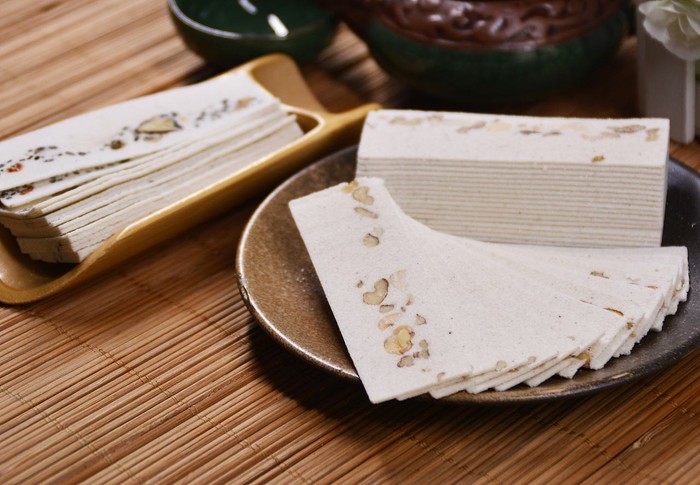 合川桃片是是重庆合川区传统名点之一,始创于1840年。它是一种由糯米、核桃、面粉、白糖等制成的片状糕点,其形为薄片,色泽洁白,散如展卷,卷裹不断,点火即燃,入口化渣,软糯滋润,细腻香甜,兼核桃、玫瑰清香,清新爽口。合川桃片所用糯米、白砂糖、核桃仁等均选上等优质原料,选料过程严格,制作工艺独特,经选料、捂料、炒米、等近20道工序,每道工序皆精细考究。例如,将炖好的糕坯切成薄片,每片仅几毫米厚,还要使每片桃片厚度基本一致。