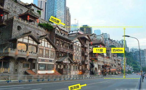 洪崖洞所在区域原始地形为崖壁加缓坡,是渝中半岛的典型地貌之一。整个吊脚楼建筑群随坡就势而建,所以1楼出去是马路,11楼出去还是马路。