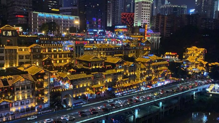 在洪崖洞能够充分感受到重庆3D魔幻效果,你以为的1楼,其实是洪崖洞的11楼。当你跟着指示一层一层电梯走下去了之后,你会发现你居然到了平地,人来车往的!!!