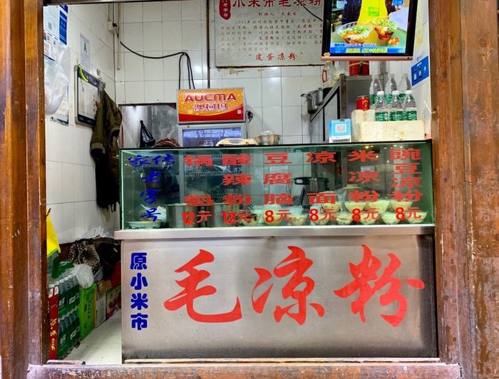 毛凉粉创建于1942年,同期与赖凉粉(川北凉粉),魏凉粉并称为“重庆三大凉粉”。现在在渝中区解放碑网红地洪崖洞4楼平街,是毛凉粉创始人的儿子在经营。一家临街店,很小,门口只有一张桌子板凳。