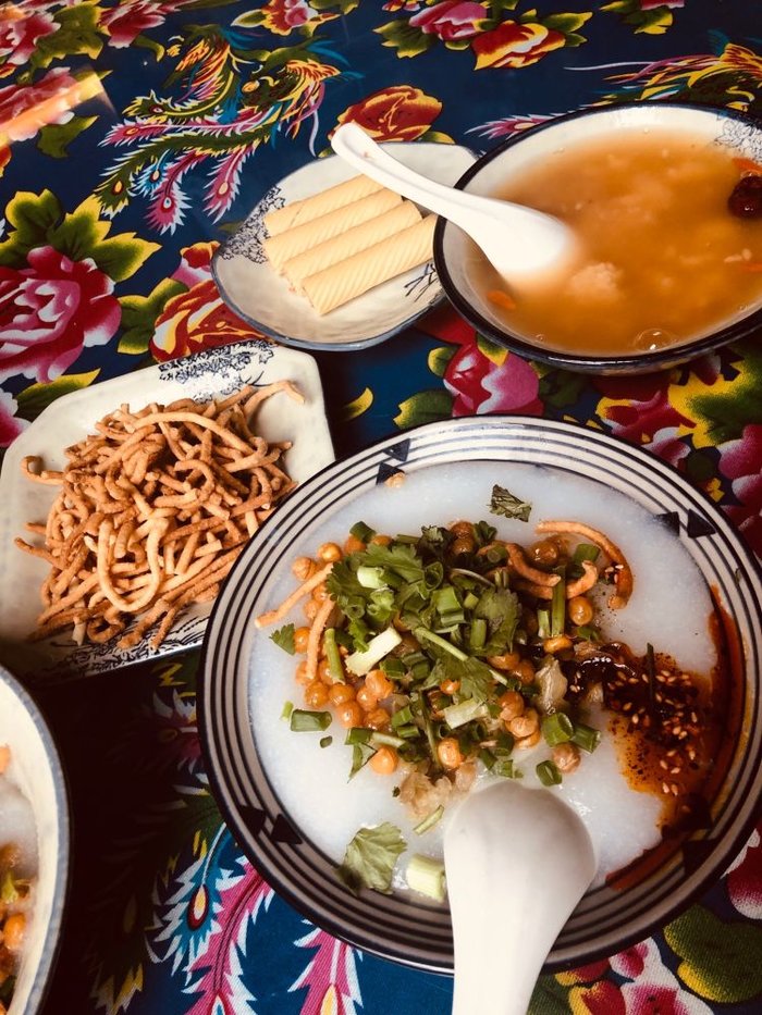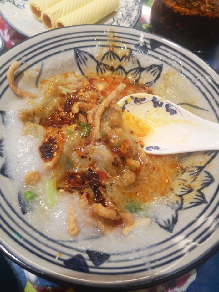 这家店位于洪崖洞9楼,下了楼梯第一家就是了。点了个套餐,里面是油茶、酒酿圆子、撒子和蛋卷。油茶影视米浆熬成的吧,里面有榨菜黄豆花椒粉,按照店家的建议把撒子捏成段放在里面,浇上辣椒油,混合起来吃。油茶有着米香,撒子脆脆的,很独特的复合的味道,倒是个很新奇的体验~