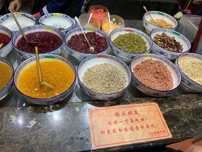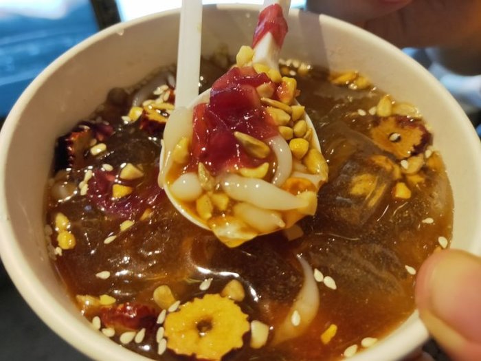 要推荐这家的理由是你们看他家冰粉里有气泡,这说明是现场手工搓的,而且配料丰富有枣片和若干种坚果,和糍粑玫瑰放一起有软有硬口感很丰富。一定要找对喔~