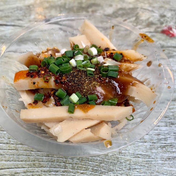 阿姨佐料动作打得特别麻利,口感和我们平时吃的凉粉口感不太一样。毛凉粉是米凉粉,每一块感觉要扎实一点,豆母子酱料我很喜欢,色泽也偏黄,吃起来很绵扎,是大米的厚实感。