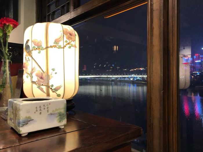 有高层和貌似三楼两个店,感觉两个视野都挺好的,对面江景都能做到一览无遗。店员推荐到三楼的那里,说视野会更开阔。坐在临江的位置,满眼是对面漂亮的建筑,看游船缓缓飘过,还有微微的凉风吹锅,还是很惬意的。店里的布置风格也算别致,连廊小门洞都挺有意思。背景一片江,想拍照不好都难呀,位置可以正对洪崖洞招牌。
