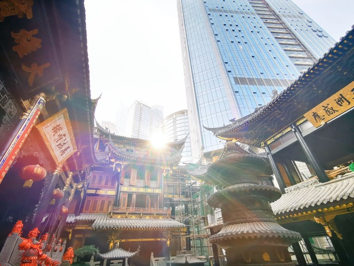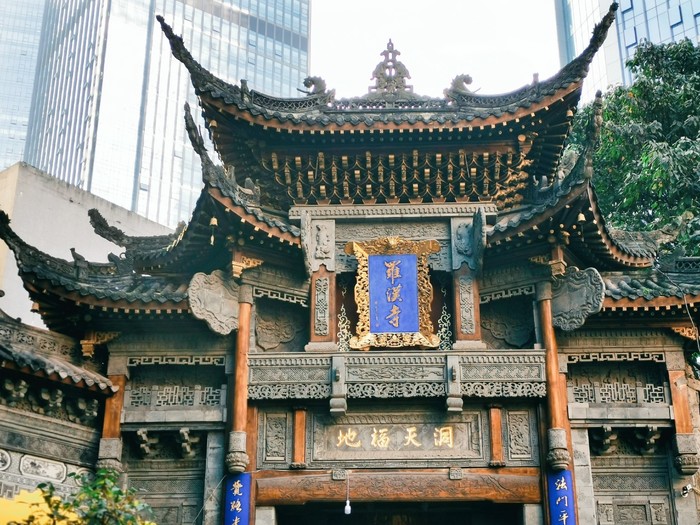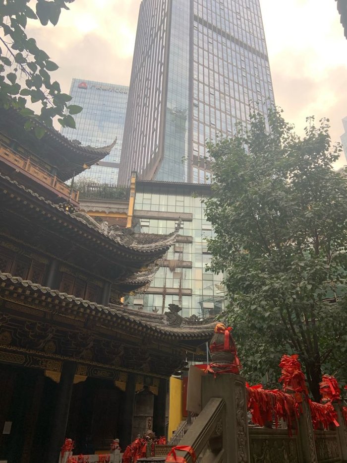 位于解放碑核心地带,电影取景地,非常嘈杂之地中的一个宗教场所,现在正在整修中,站在大雄宝殿下面,看出去近处是古朴庄严的建筑,远处是现代化的超高建筑,中间是围着绿色围布的新殿,这一方天地中,过去与未来,传统与现代,都以一种拥挤又迷样和谐的魔幻方式呈现了出来。