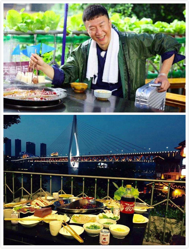 同款火锅店是位于景区4楼瀑布旁边的闹江湖九宫格江景老火锅