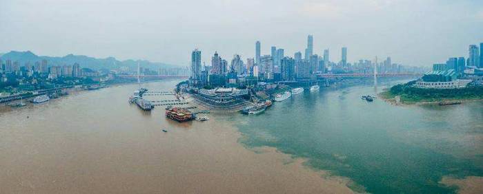 站在朝天门广场看出去,左边是碧绿的嘉陵江水,右边是褐黄的长江水,二者会合在朝天门处,清浊分明,被网友们称为重庆最大的一口鸳鸯火锅。