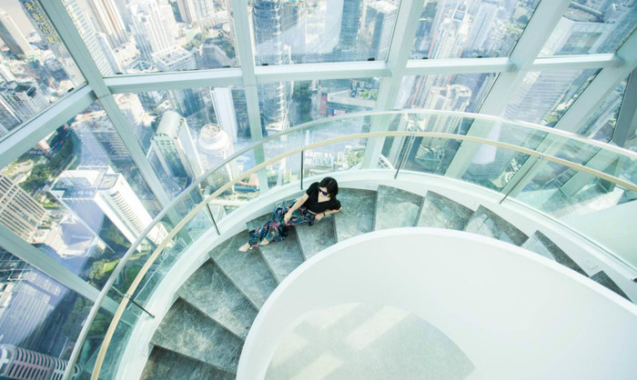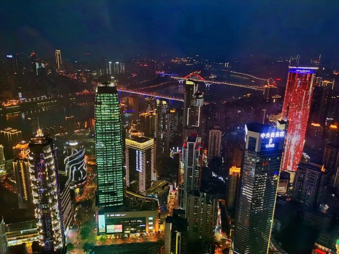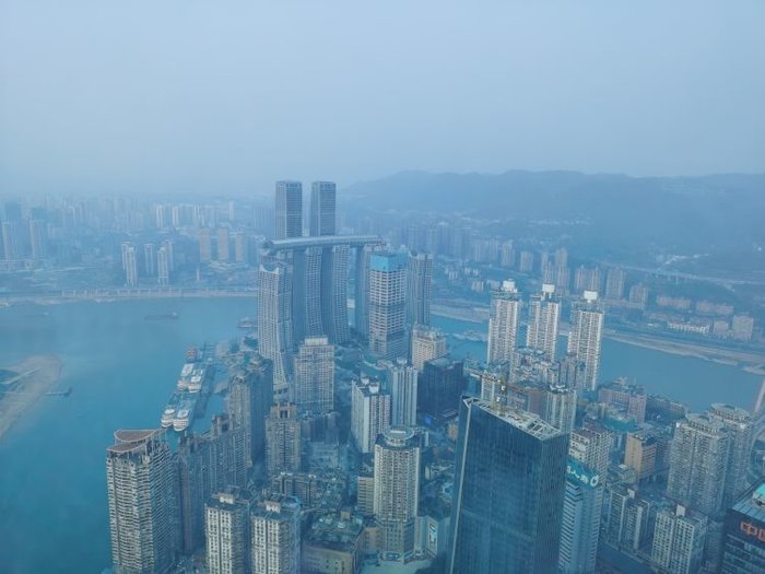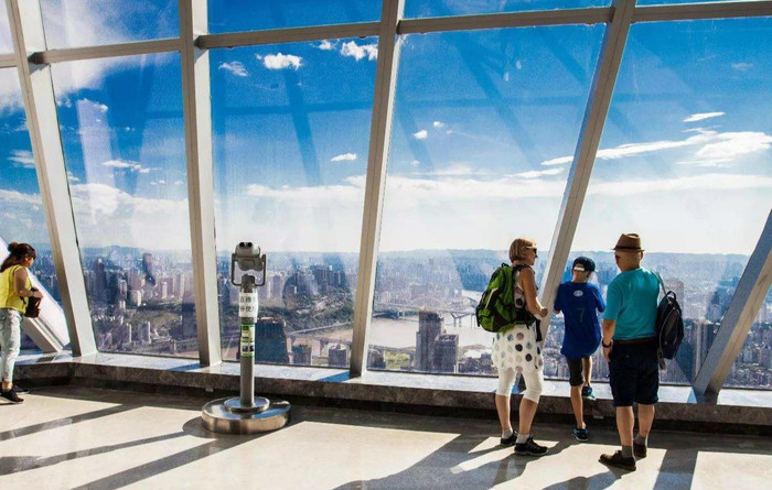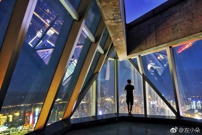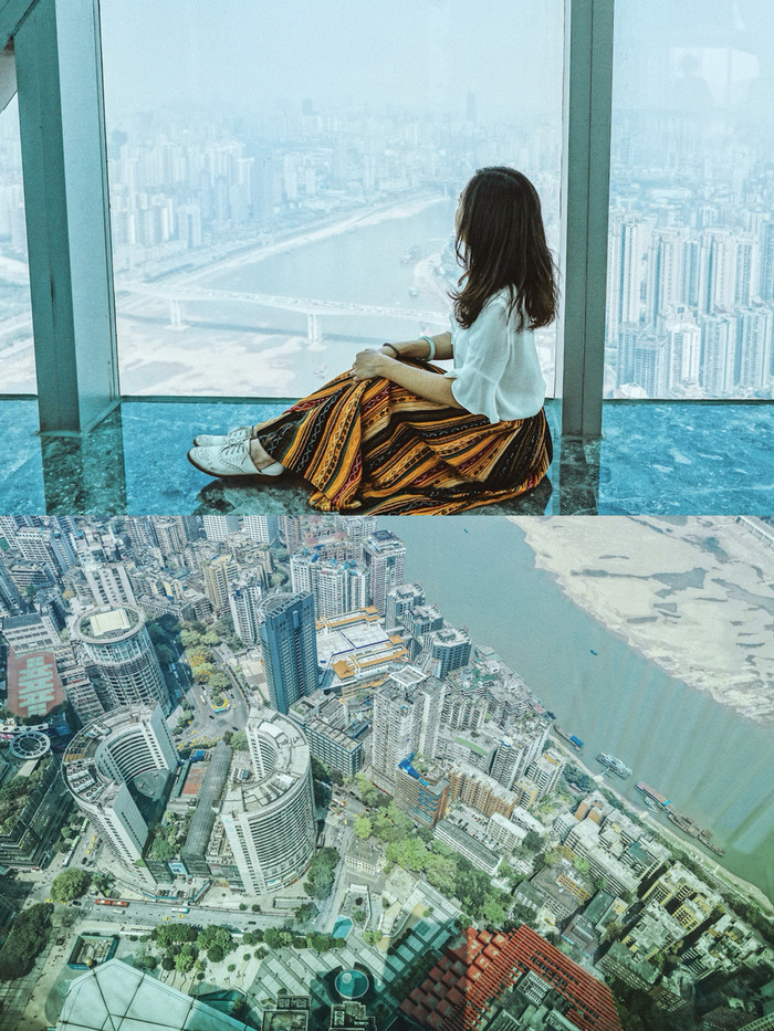 73层是一个挑高接近4米的环形大厅,360°环形玻璃幕墙,没有任何遮挡,可以俯瞰到整个重庆全城的风景。朝天门码头、江北嘴商务区、两江交汇、千厮门大桥等各种地标,全都透过巨大的玻璃窗收入眼底。