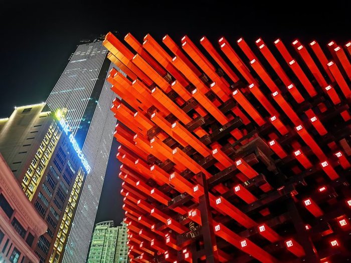 重庆国泰艺术中心由国泰大戏院和重庆美术馆组成,时常举办话剧、音乐会等演出。外形特点是黑红两色的“题凑”交织堆砌,远远望去像一团熊熊燃烧的篝火。这里是解放碑的地标建筑之一,距离热门景区洪崖洞比较近。