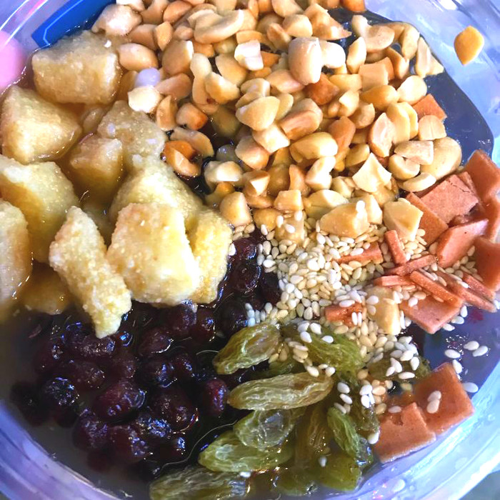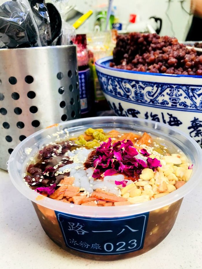 玫瑰糍粑冰粉,料足如图,里面什么都有。把所有的料拼命搅搅搅匀,然后吃一大口真的是大快朵颐!最爱的是糍粑和玫瑰酱,糍粑在冰粉里面非常q弹,配上玫瑰和花生的味道,真的美滋滋啊啊啊,冰冰凉凉,太好吃了,回味无穷。