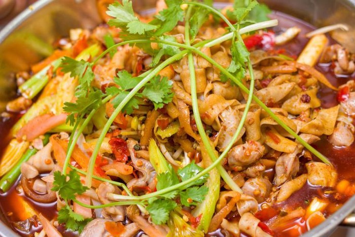 黔江鸡杂,泛指鸡的内脏,即鸡心、鸡珍、鸡肠和鸡肝之类。这是地道的川渝风味菜,鸡杂腥膻味重,将其与辣椒、泡椒和葱姜蒜同炒,既可以除去鸡杂的异味,还使成菜脆嫩鲜香、辣得人食欲大增。