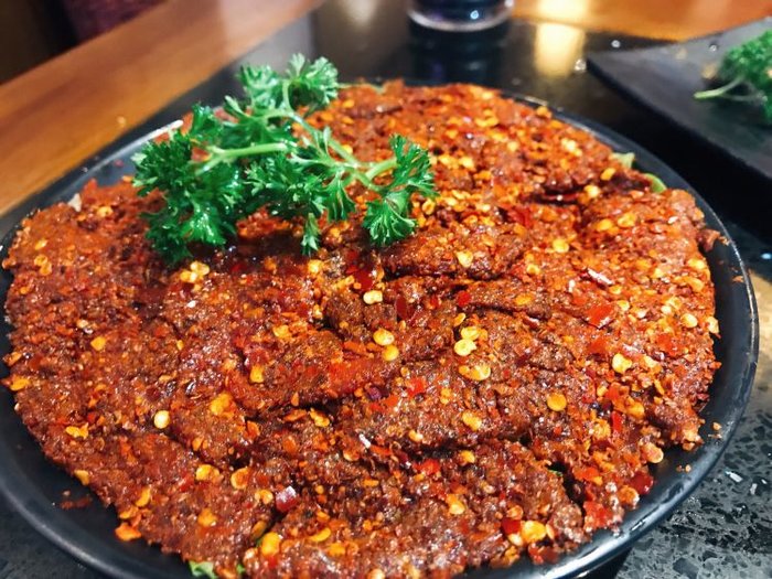 「麻辣牛肉」:大块牛肉用当地花椒大料腌制,非常入味,辣得过瘾。