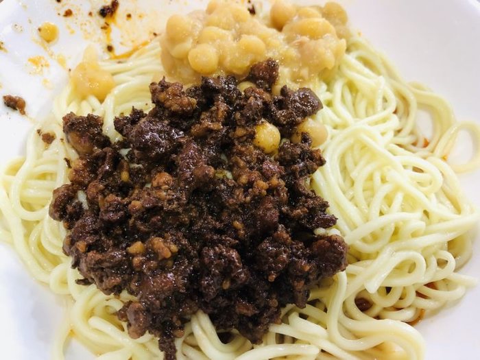 常见的干溜豌杂面,佐料都是铺在碗底的↓