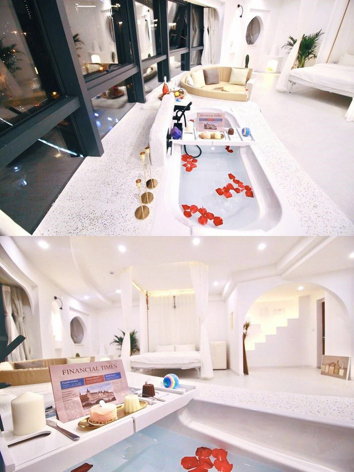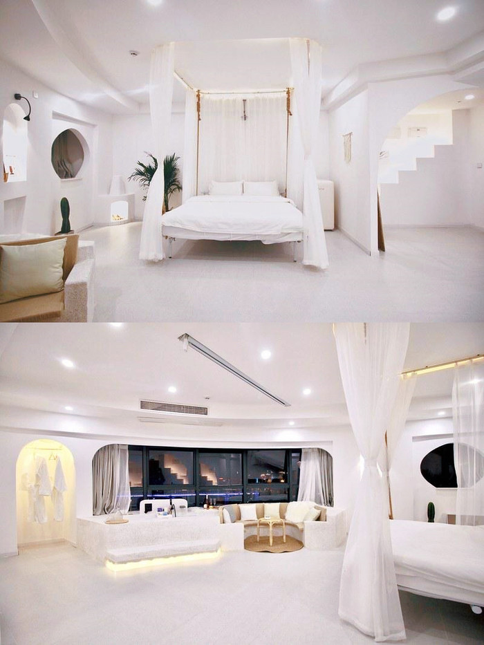 盐白系洞穴风格的造型有非常强的设计感,住进去清新干净又带有一丝异域风情,最吸引我的的还是这个360度的环形落地窗,视野非常开阔,采光非常好,尤其是夜晚,两岸的灯火点亮,城市瞬间变得璀璨迷人。窗前还有一个纯手工打造的浴缸,粗糙有质感的磨石设计,非常的独特。点上蜡烛,倒上一杯红酒,来一个玫瑰花瓣浴,凹造型绝对没问题哒!
